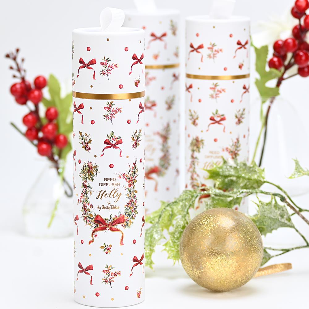 Η εντυπωσιακή συσκευασία, διακοσμημένη με γιορτινό στεφάνι, κόκκινους φιόγκους, καρπούς και χρυσές πινελιές, αποπνέει κομψότητα και πολυτέλεια.