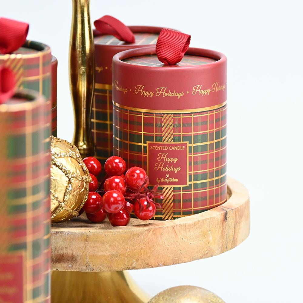 Ένα αρωματικό κερί με διαχρονικό καρό σχέδιο και χρυσές πινελιές, που αποπνέει κομψότητα και γιορτινή πολυτέλεια.