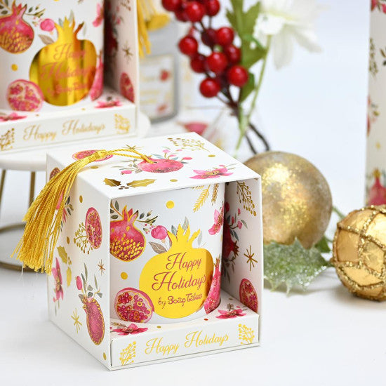 Η συσκευασία είναι εμπνευσμένη από το ρόδι, διακοσμημένη με εντυπωσιακά μοτίβα και χρυσές πινελιές. Το ρόδι, σύμβολο αφθονίας, καλοτυχίας και ευημερίας, χαρίζει στο κερί ξεχωριστό χαρακτήρα και το μετατρέπει σε ένα δώρο με ιδιαίτερο νόημα.