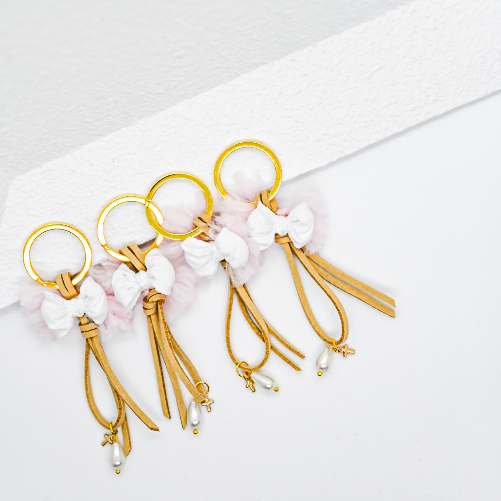 Μπρελόκ σουέτ με αρωματικό στοιχείο φιογκάκι και επίχρυσο σταυρουδάκι.