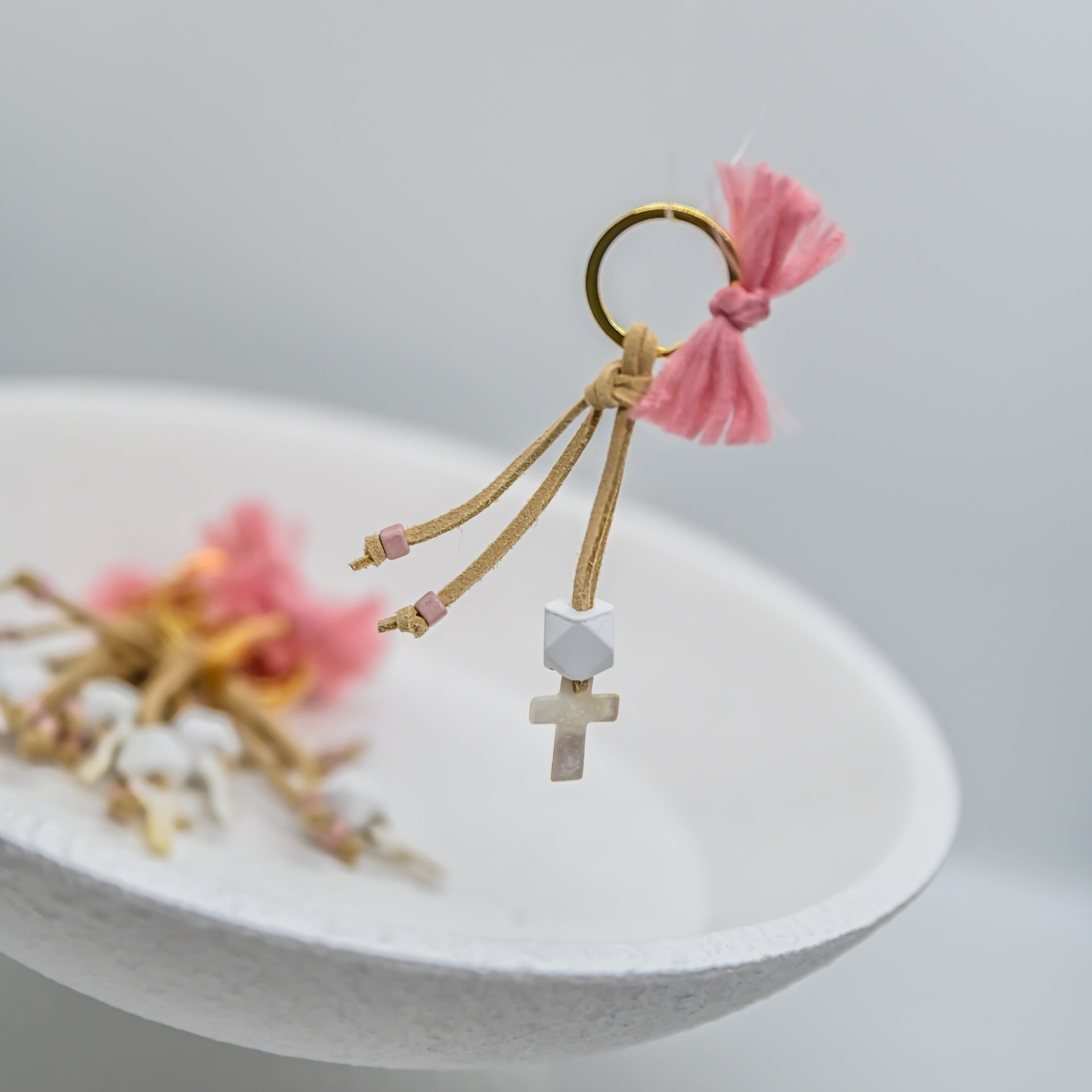 Μπρελόκ σουέτ με αρωματική χάντρα και φίλντισι σταυρό.
