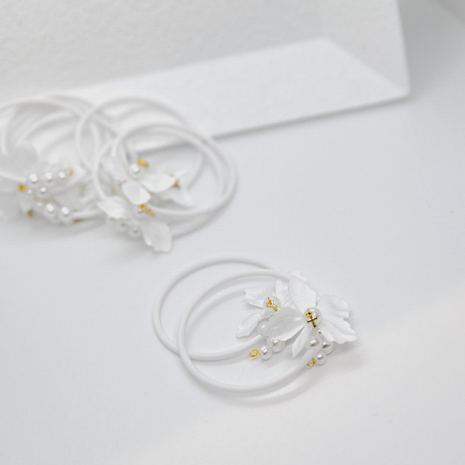 Χειροπέδα καουτσούκ με πέρλες, μεταξωτό λουλούδι και επίχρυσο σταυρουδάκι.
