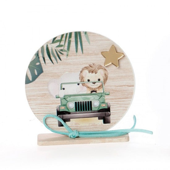 Μπομπονιέρα βάπτισης ξύλινο καδράκι σε στρογγυλό σχήμα πάνω σε βάση με ζωάκι σαφάρι
