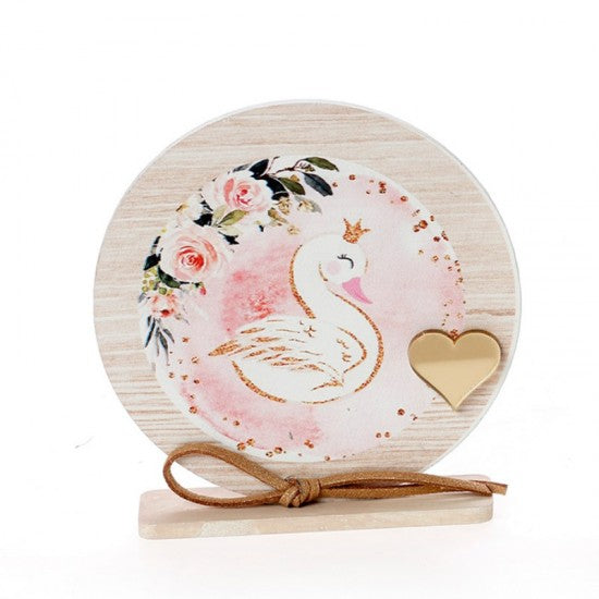 Μπομπονιέρα βάπτισης ξύλινο καδράκι σε στρογγυλό σχήμα πάνω σε βάση με κύκνο
