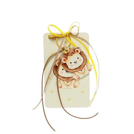 Μπομπονιέρα με ξύλινη πλάτη και μπρελόκ με σχέδιο λιονταράκι