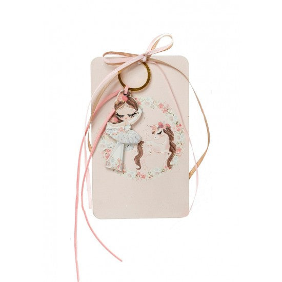 Μπομπονιέρα με ξύλινη πλάτη και μπρελόκ με σχέδιο μπαλαρίνα