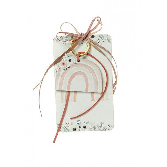 Μπομπονιέρα με ξύλινη πλάτη και μπρελόκ με σχέδιο ουράνιο τόξο