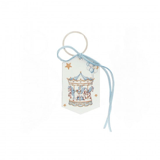 Μπομπονιέρα ξύλινο μπρελόκ με σχέδιο καρουζέλ σε απαλές μπλε και χρυσές αποχρώσεις, ιδανικό για παιδικά δώρα και βαπτίσεις.