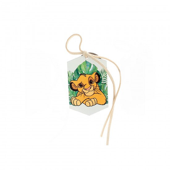 Μπομπονιέρα ξύλινο μπρελόκ με σχέδιο τον Simba μέσα σε ζούγκλα, ιδανικό για παιδικά δωράκια και θεματικά αναμνηστικά