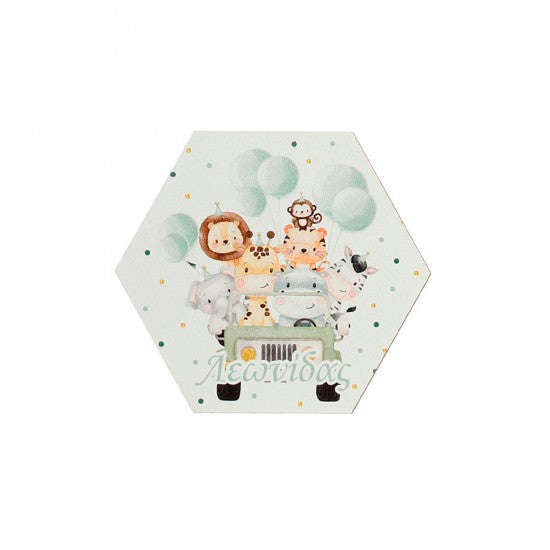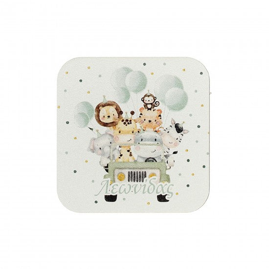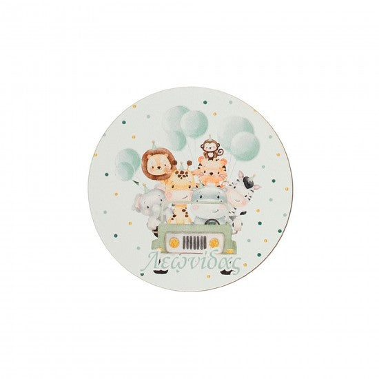 Μπομπονιέρα ξύλινο σουβέρ βάπτισης με χαριτωμένο σχέδιο ζωάκια σαφάρι. Δυνατότητα προσωποποίησης με το όνομα του παιδιού και επιλογής σχήματος στρογγυλό, εξάγωνο ή τετράγωνο.