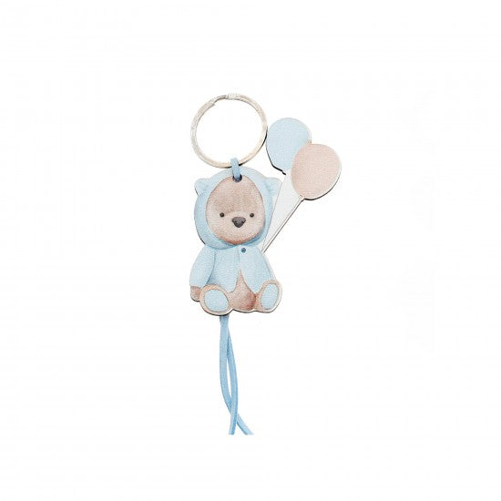 Μπομπονιέρα χειροποίητο ξύλινο μπρελόκ με αρκουδάκι ντυμένο με μπλε φορμάκι, κρατώντας μπαλόνια. Ιδανικό για παιδικά δώρα και αναμνηστικά βάπτισης.