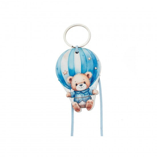 Μπομπονιέρα χειροποίητο ξύλινο μπρελόκ με χαριτωμένο αρκουδάκι σε μπλε αερόστατο, ιδανικό για δώρο βάπτισης και παιδικά δωμάτια.