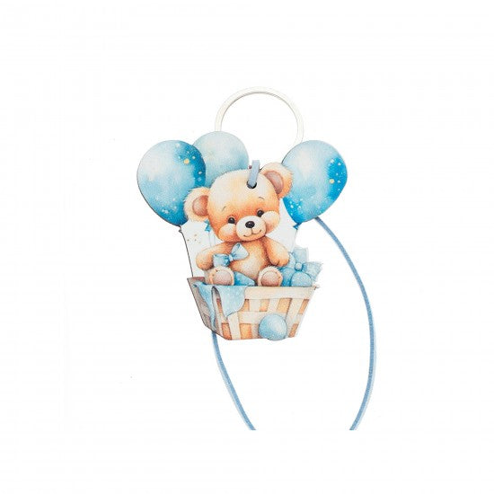 Μπομπονιέρα χειροποίητο ξύλινο μπρελόκ με αρκουδάκι σε καλάθι και μπλε μπαλόνια. Ιδανικό για παιδικά δώρα και βαπτίσεις.