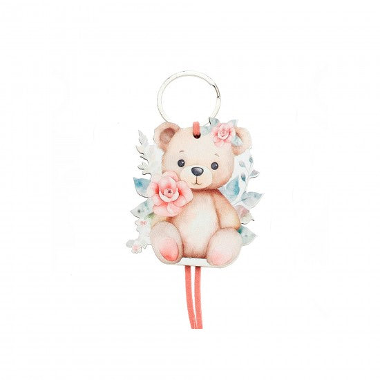 Μπομπονιέρα χειροποίητο ρομαντικό ξύλινο μπρελόκ με αρκουδάκι και λουλούδια, ιδανικό για παιδικά δώρα, βάπτιση ή διακοσμητικό αξεσουάρ.