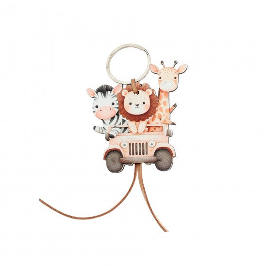 Μπομπονιέρα χειροποίητο ξύλινο μπρελόκ με χαριτωμένα ζωάκια σαφάρι σε τζιπ. Ιδανικό για αναμνηστικά βάπτισης και παιδικά δώρα.
