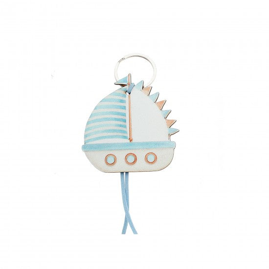 Μπομπονιέρα χειροποίητο ξύλινο μπρελόκ σε σχήμα καραβιού με γαλάζιες λεπτομέρειες, ιδανικό για ναυτικά θέματα βάπτισης και καλοκαιρινά δώρα.