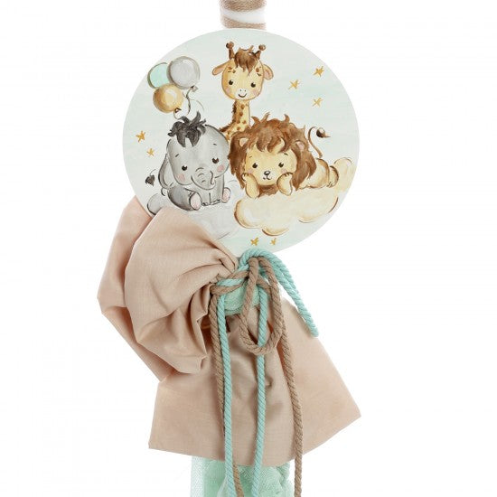 ✔ Λαμπάδα βάπτισης, διακοσμημένη με ξύλινο στοιχείο ζωγραφικής των ζώων, αέρινα υφάσματα και φυσικά σχοινιά.
