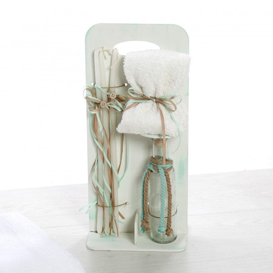✔ Σετ λαδιού με μπουκαλάκι, σαπούνι και κεράκια, διακοσμημένα σε παστέλ χρώματα με κορδέλες και φυσικά στοιχεία.