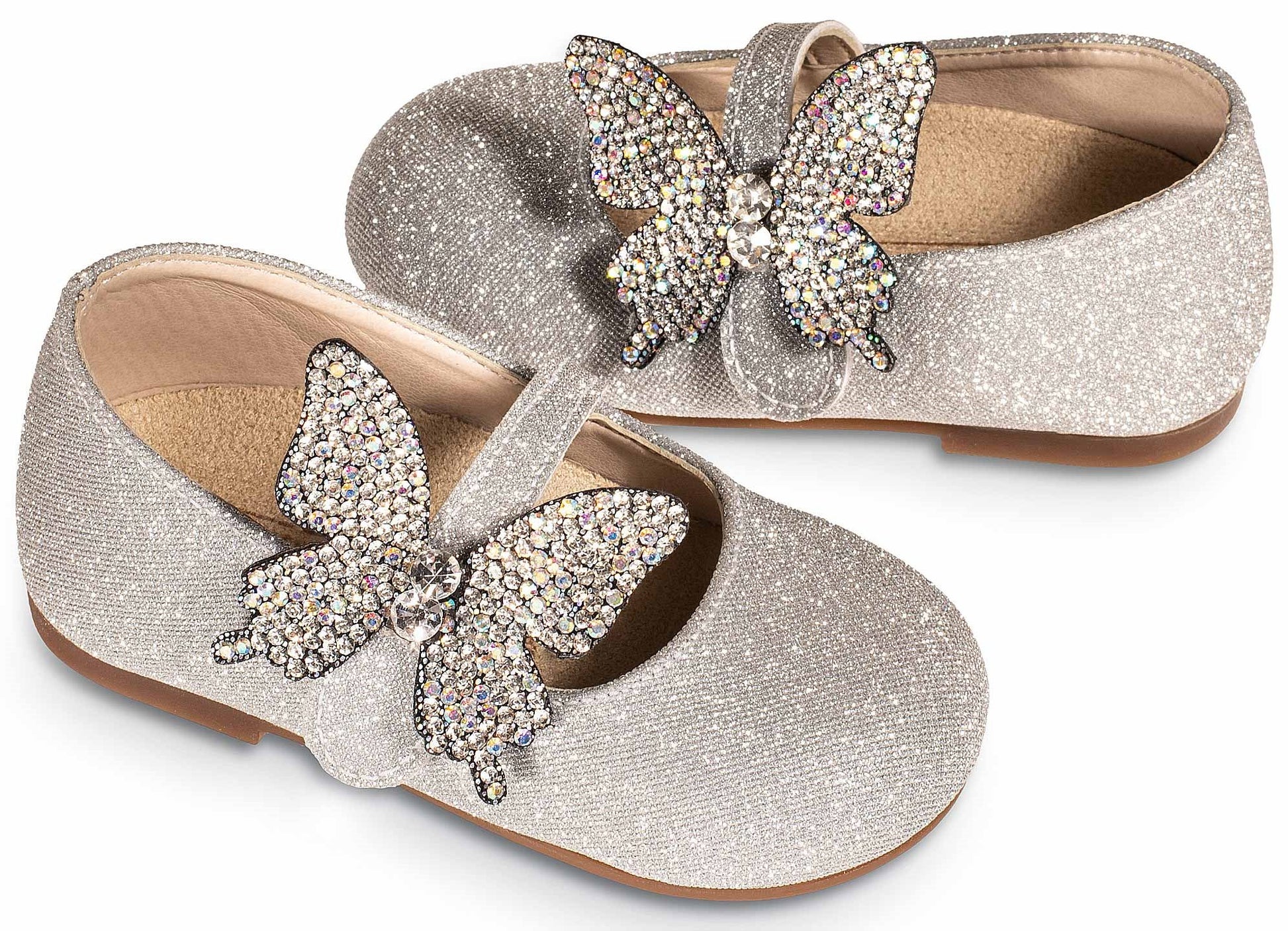 Γοβάκι απο Μεταλλιζέ Ύφασμα και Στρασένια Πεταλούδα στο Πλάι σε Ασημί Χρώμα