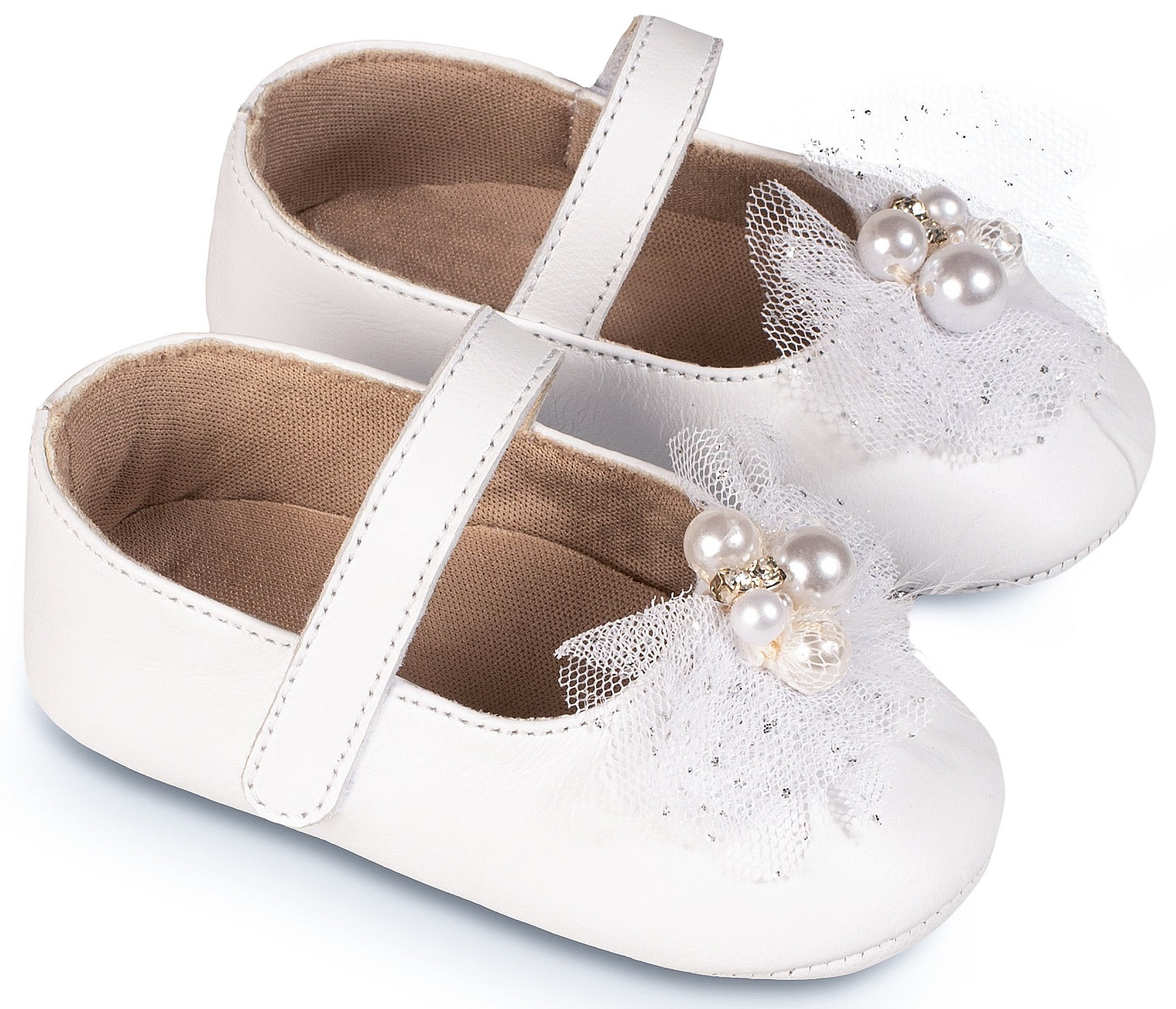 Δερμάτινο Γοβακι Μονή Μπαρέτα με Χειροποίητο Διακοσμητικό απο Τούλι και Πέρλες σε Λευκό Χρώμα MI1641