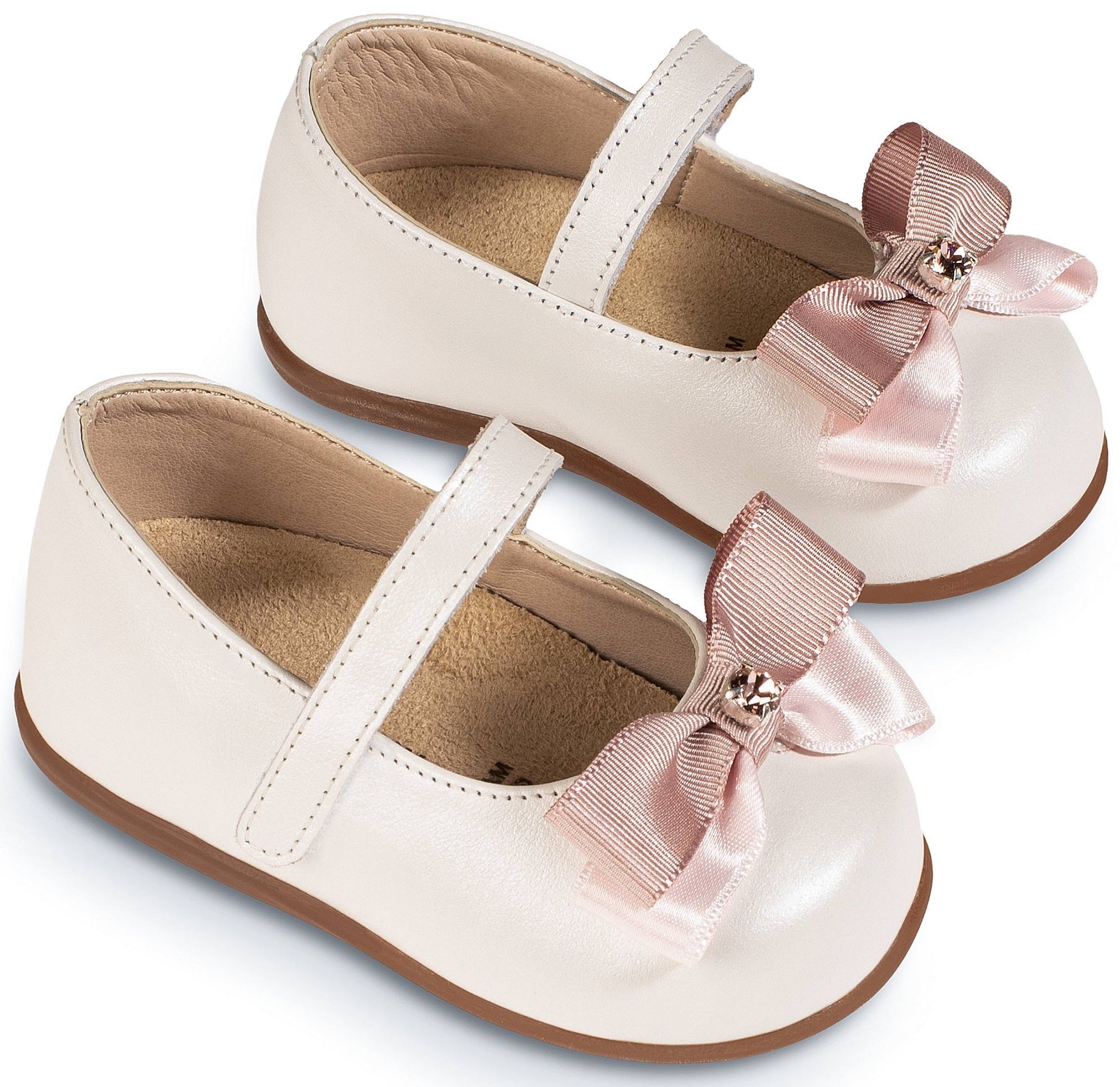 Δερμάτινο Γοβάκι Μονή Μπαρέτα με Χειροποίητο Δίχρωμο Φιόγκο με Στρας σε Εκρού Ροζ Χρώμα PRI2633